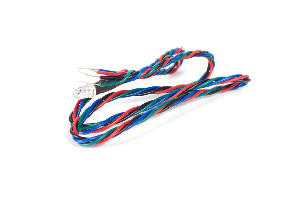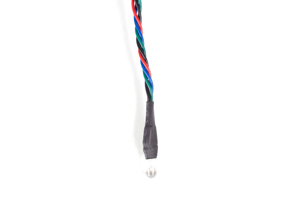 A super-bright tri-color 5mm common cathode LED with a 50 cm long braided cable. This LED contains individually controllable red, green, and blue color elements. Each element has a suggested current consumption of 20 mA.
